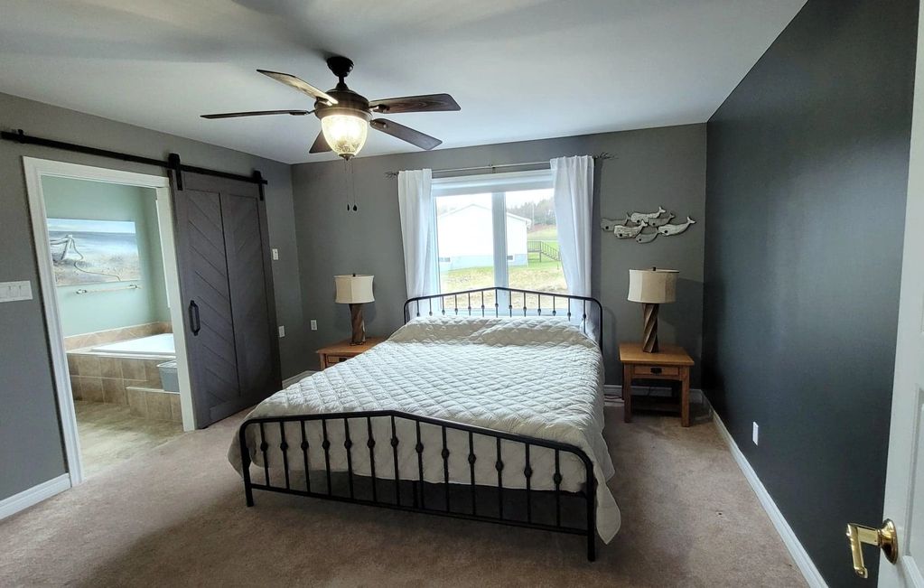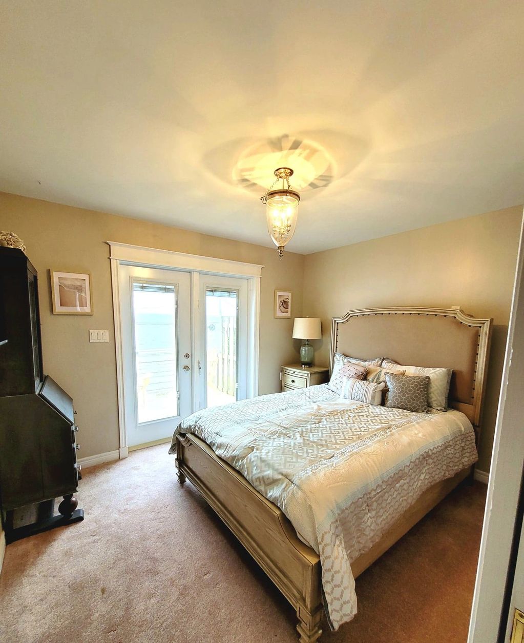 Main floor bedroom with queen bed and access to patio with ocean view.
